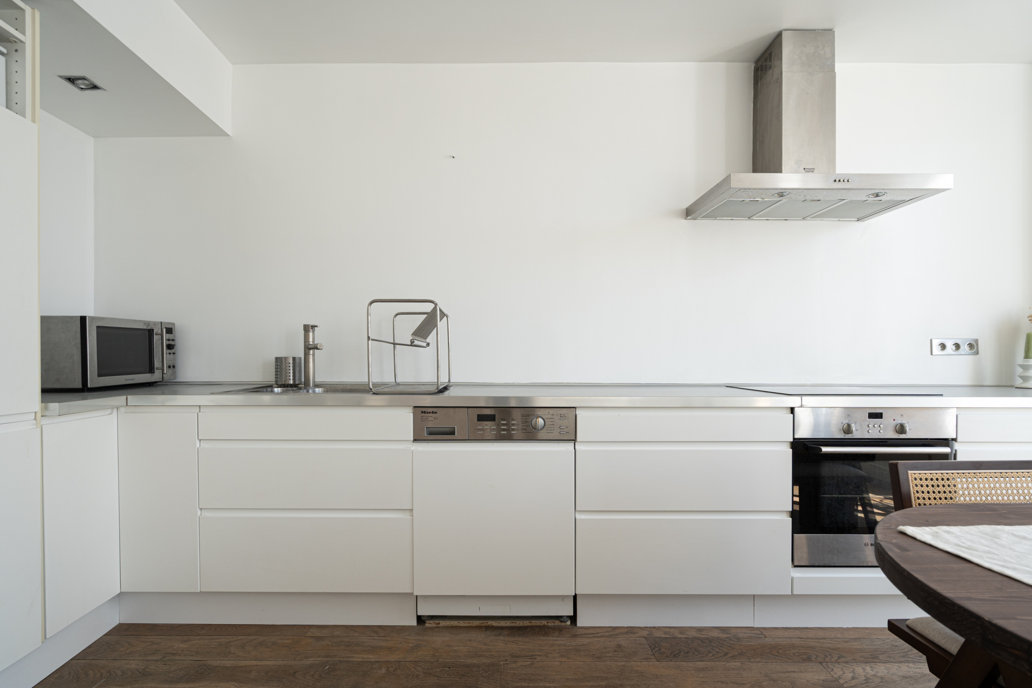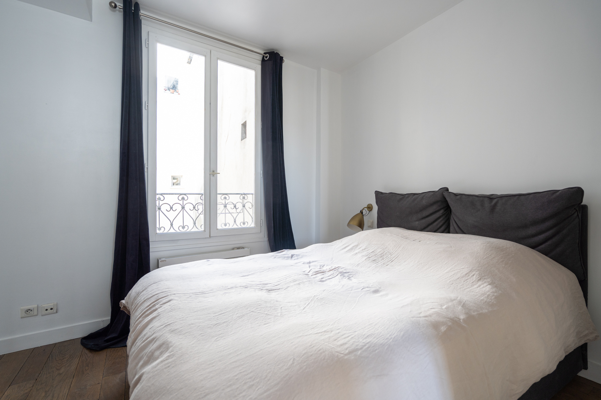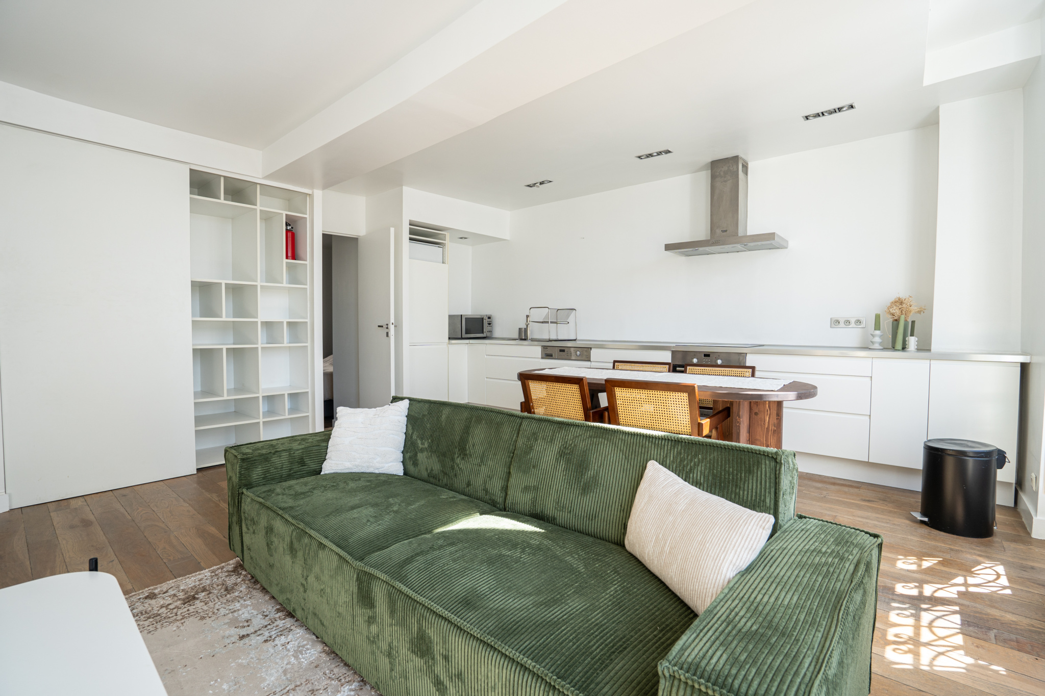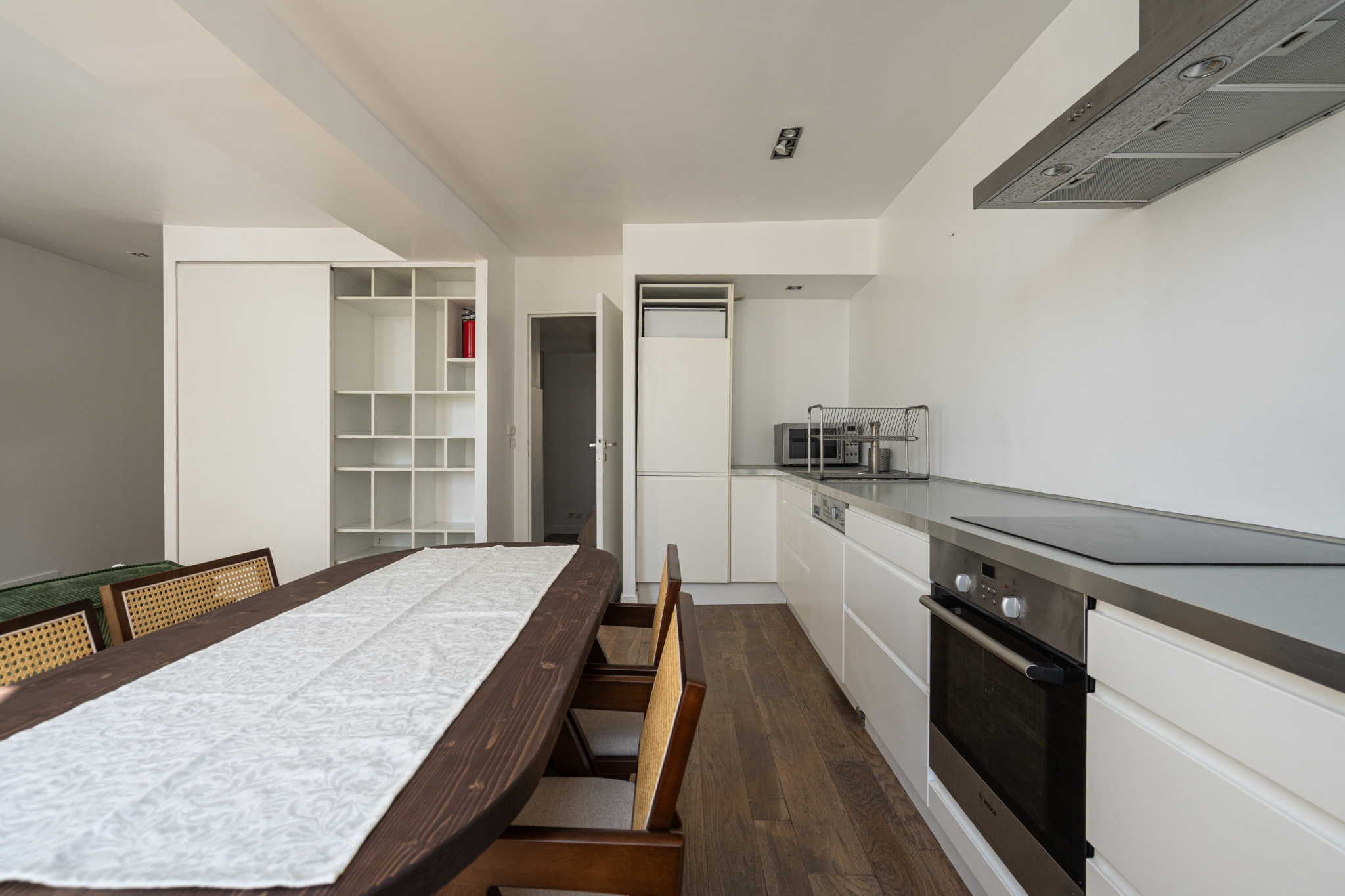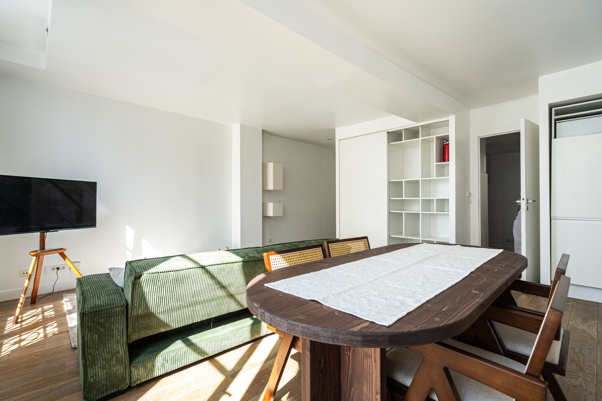 Le beau parquet et les murs blancs contribuent au caractère particulièrement épuré de cet appartement qui dispose d’un magnifique parquet, d’une cuisine entièrement équipée, d’une salle de bain moderne et de rangements intégrés. Les espaces ont été soigneusement agencés pour maximiser la luminosité et le confort, offrant un intérieur fonctionnel et raffiné.