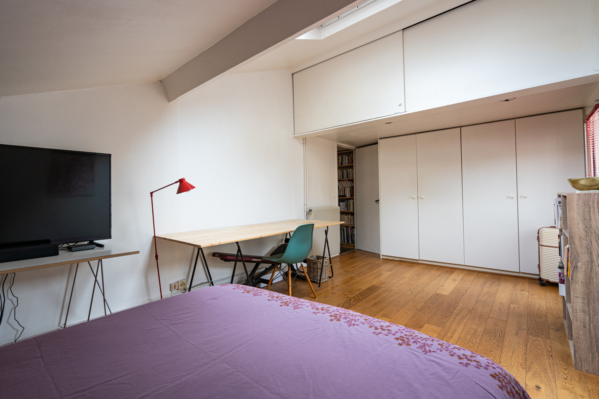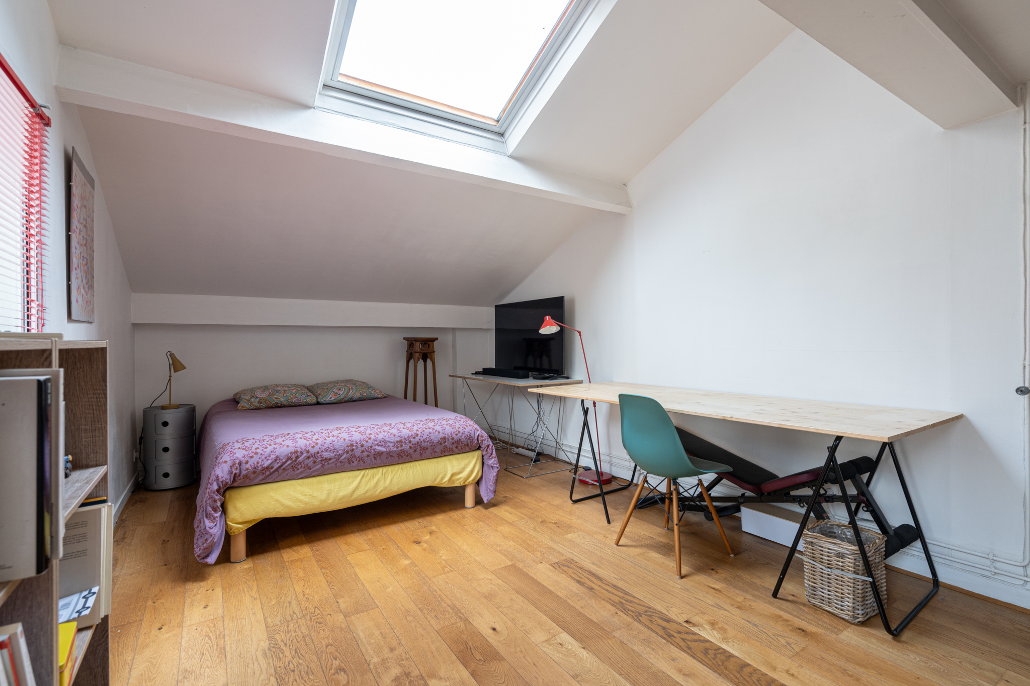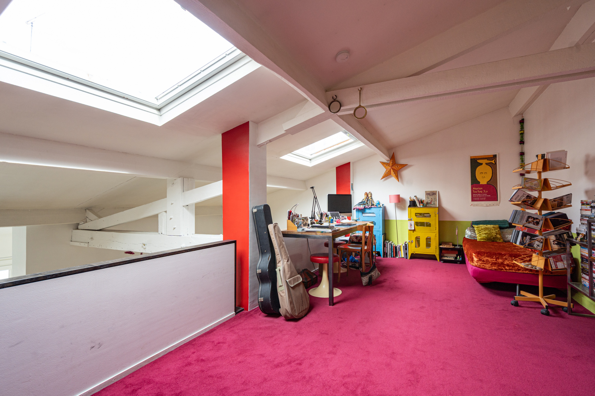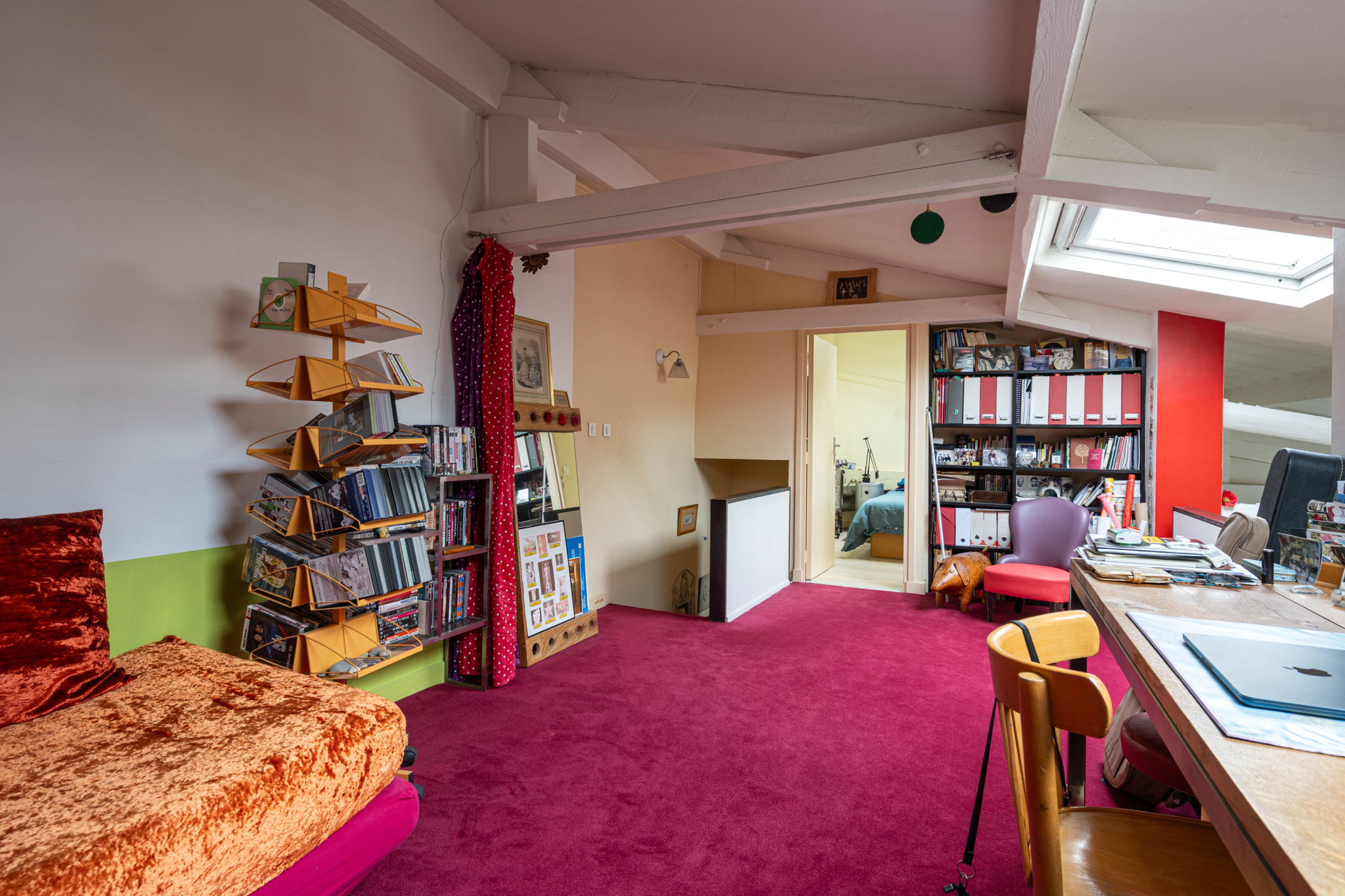 À l’étage supérieur, la mezzanine sera une autre aire de création ou de rangement, tandis que le bureau de 18 m2, voisin de la seconde chambre, se prête aisément à l’accueil d’un atelier, d’une bibliothèque, voire d’une troisième chambre.