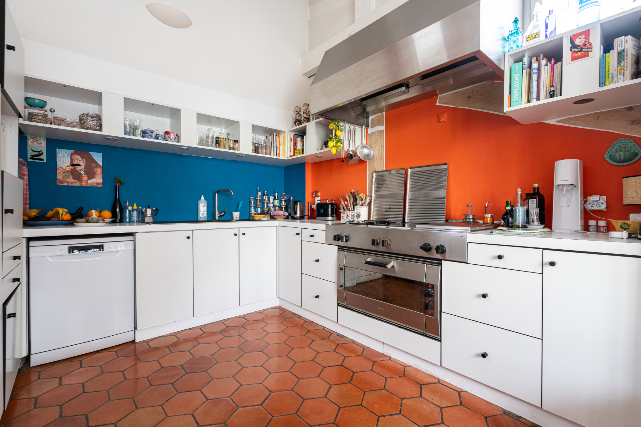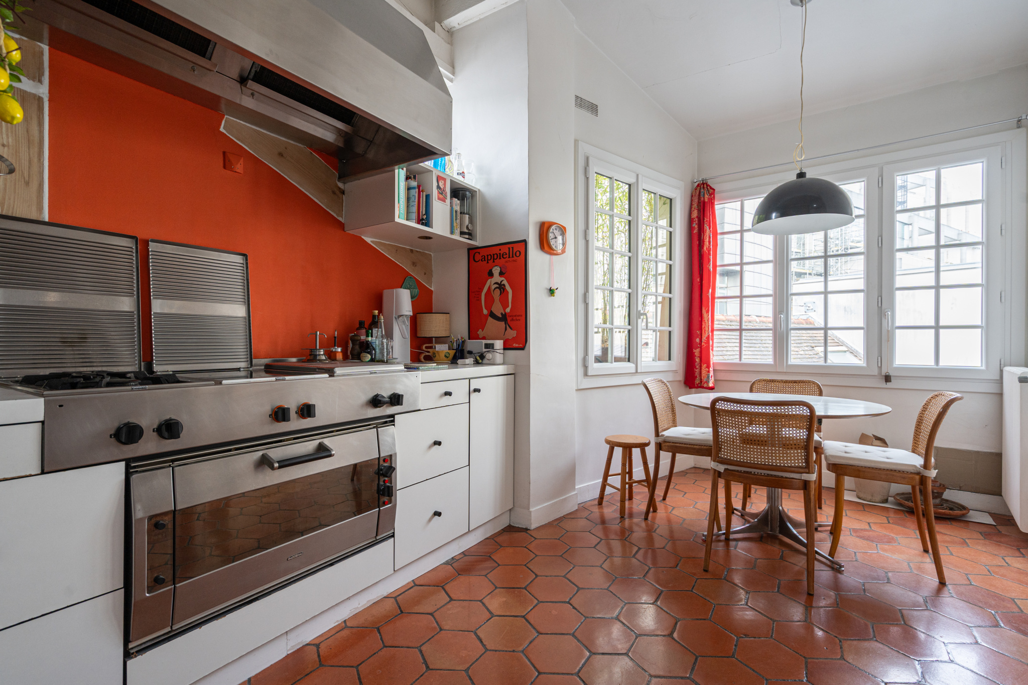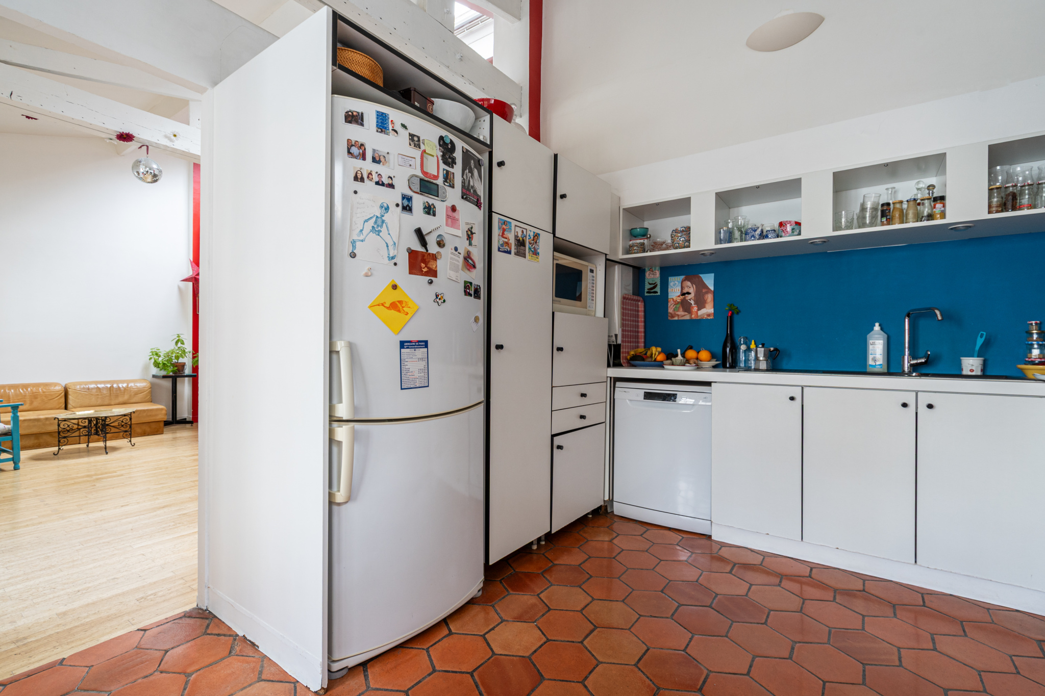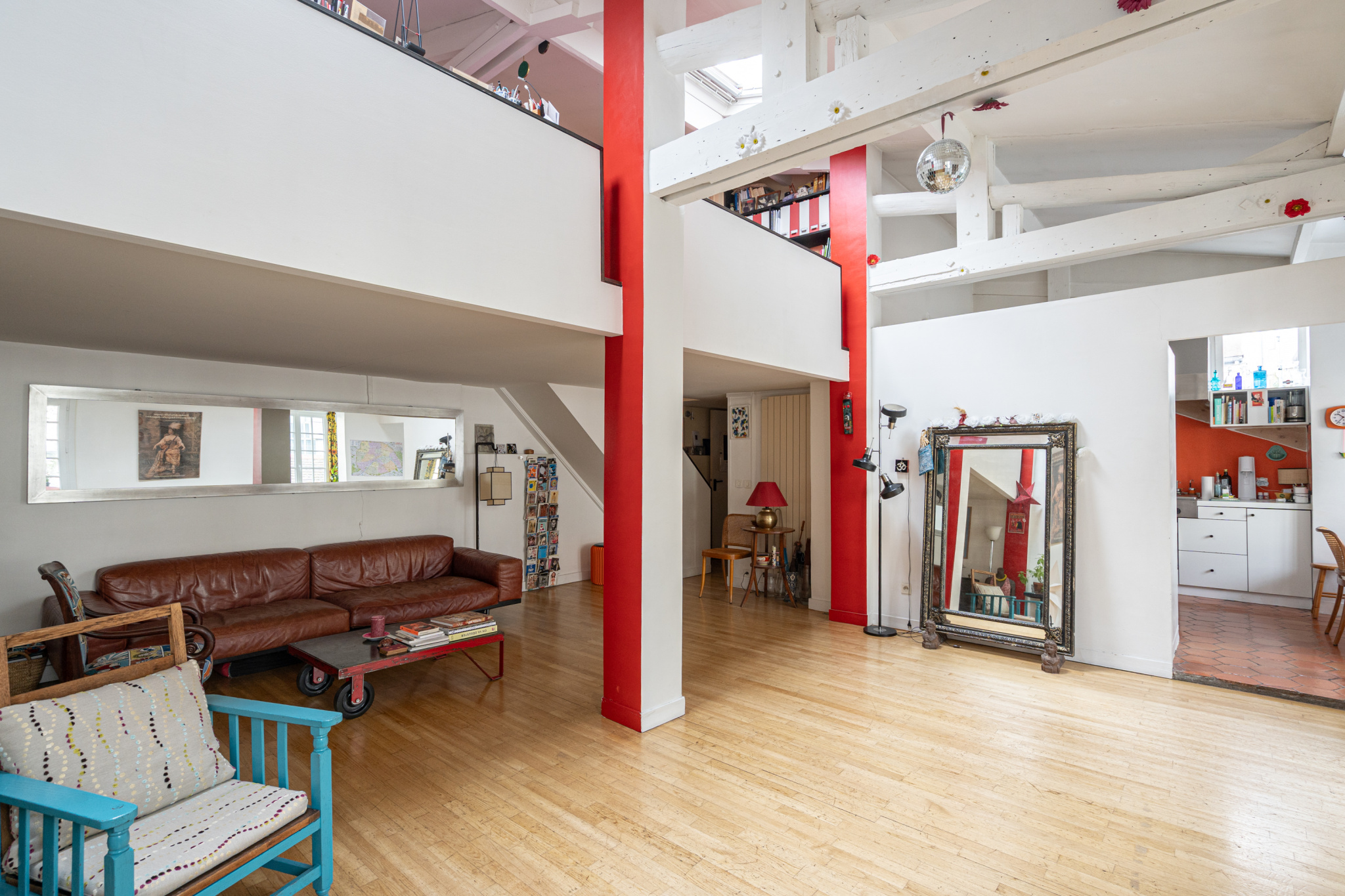 Cette vaste pièce recouverte de parquet invite à l’imagination et à la création, tandis que la cuisine, avec ses tomettes au sol, ne manque pas non plus de place ni de rangements.