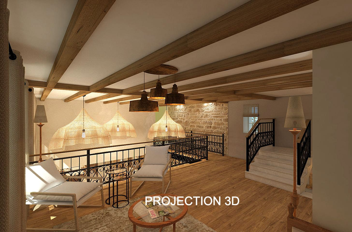Derrière ses murs chargés d’histoire et aux tons reconnaissables, la bâtisse principale abrite des pièces chaleureuses, en harmonie avec le style de la maison. Le rez-de-chaussée accueille une cuisine ouverte et un vaste séjour-cathédrale qui se prolonge sur une mezzanine, des WC adaptés aux personnes en fauteuil ainsi qu’un espace dégustation « cave à vin », qui pourra être repensé en bureau ou en chambre avec sa terrasse privative.