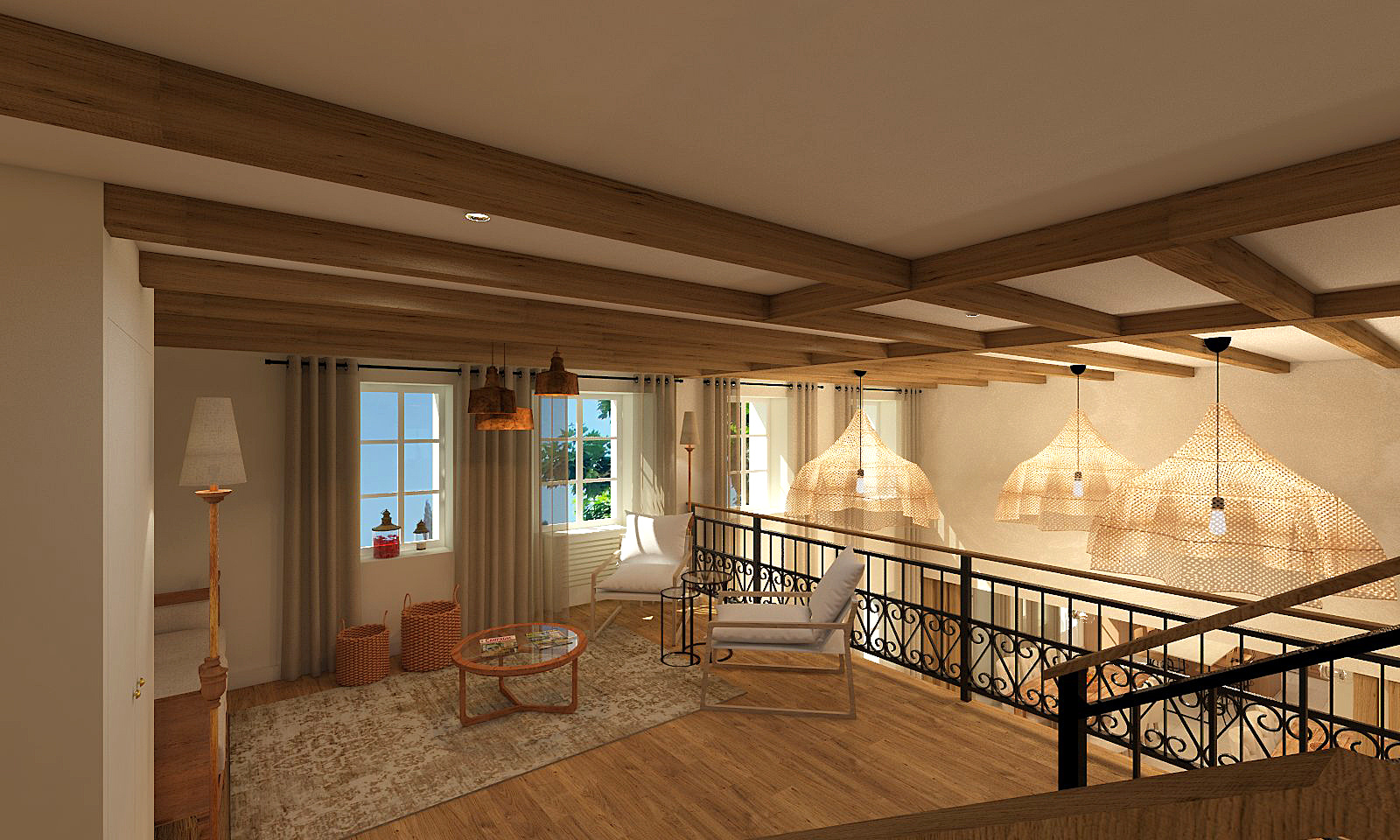 Dans les étages, on trouve quatre chambres doubles avec chacune leur salle de bain ou de douche. Outre ces confortables suites, un salon ouvert sur le séjour inférieur est présent au premier étage, tandis que le deuxième étage accueille la lingerie.
