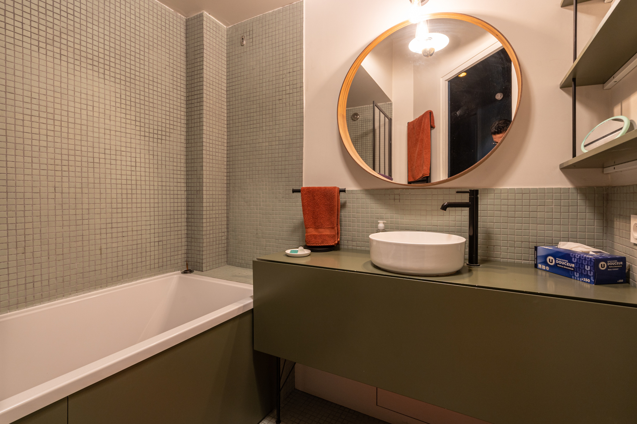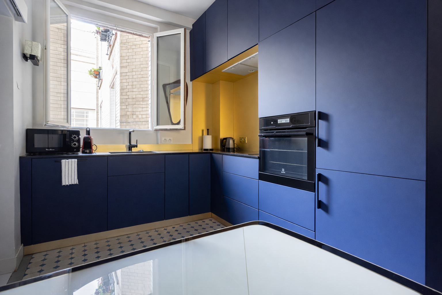 Une touche de modernité et de couleur a été apportée aux autres pièces, comme dans la cuisine design, entièrement équipée.