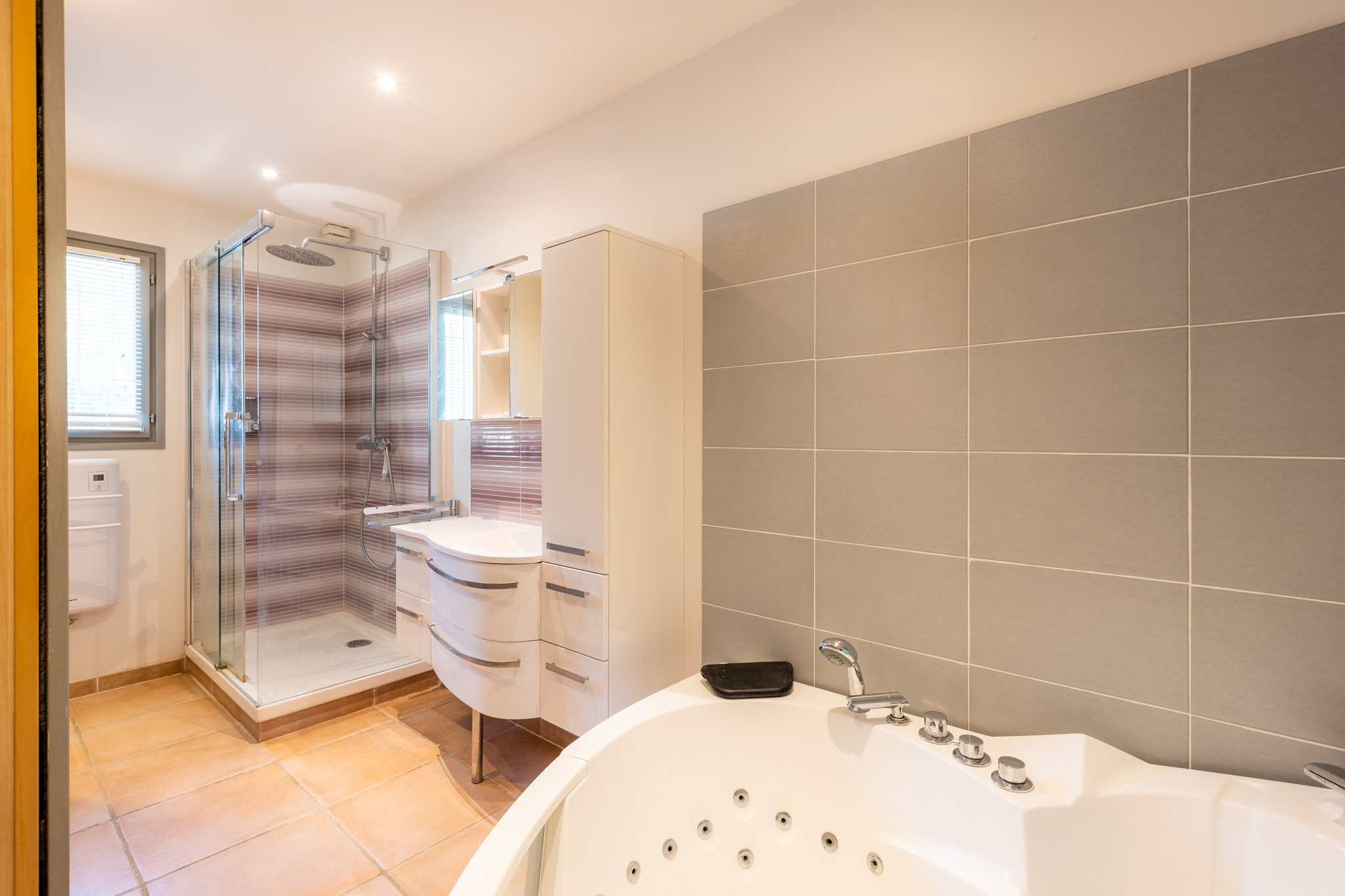Villa principale : 182 m2 habitables, comprenant 5 chambres et 3 salles de bains/douches, dont une suite parentale, un séjour-salon de 60 m2 et une cuisine équipée, avec de nombreuses ouvertures sur l’extérieur pour une atmosphère lumineuse et conviviale. Chacun des deux niveaux présente une salle d’eau et des WC indépendants, tandis que la suite parentale (au rez-de-chaussée) dispose de sa salle de bains avec toilettes.